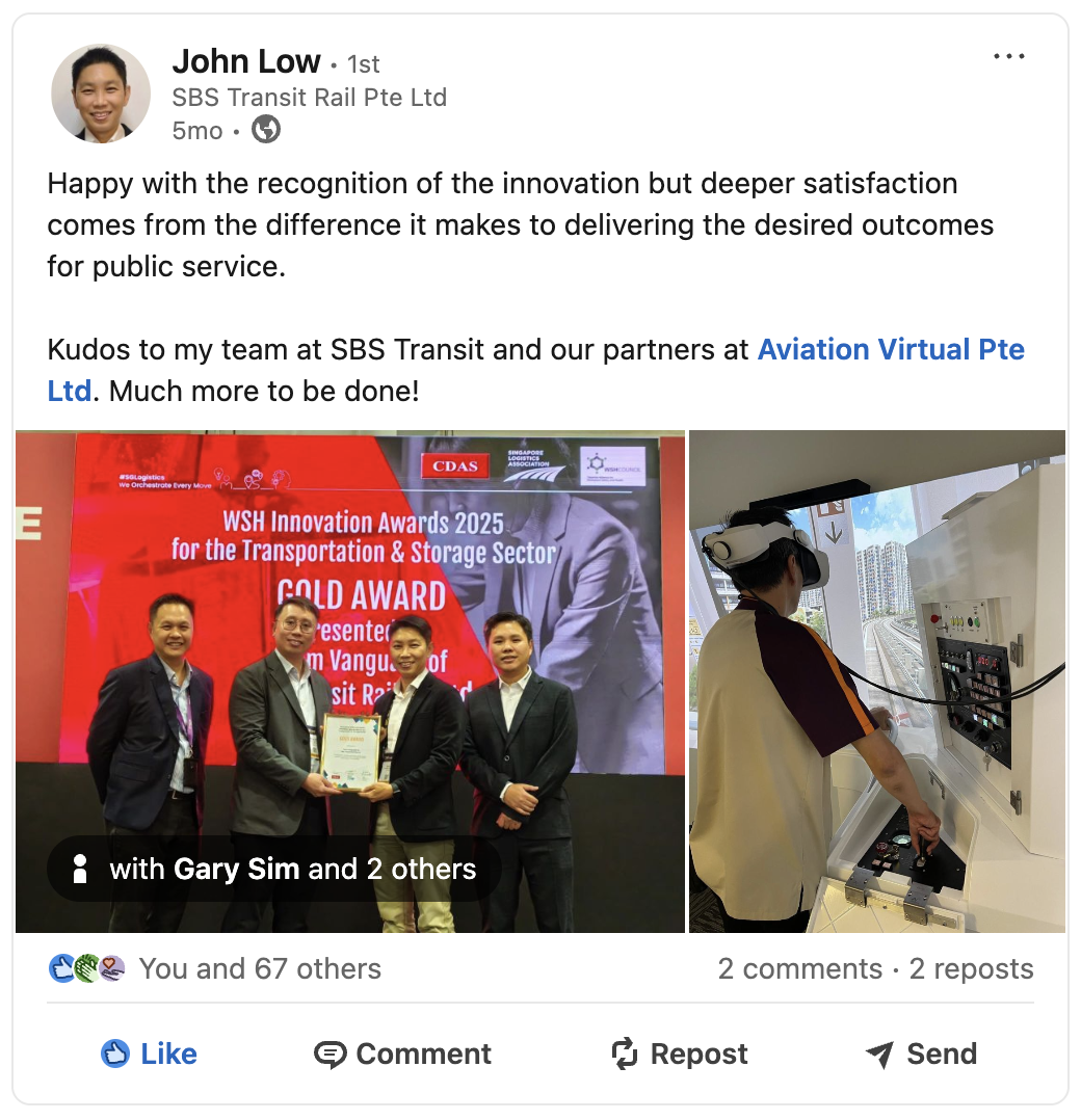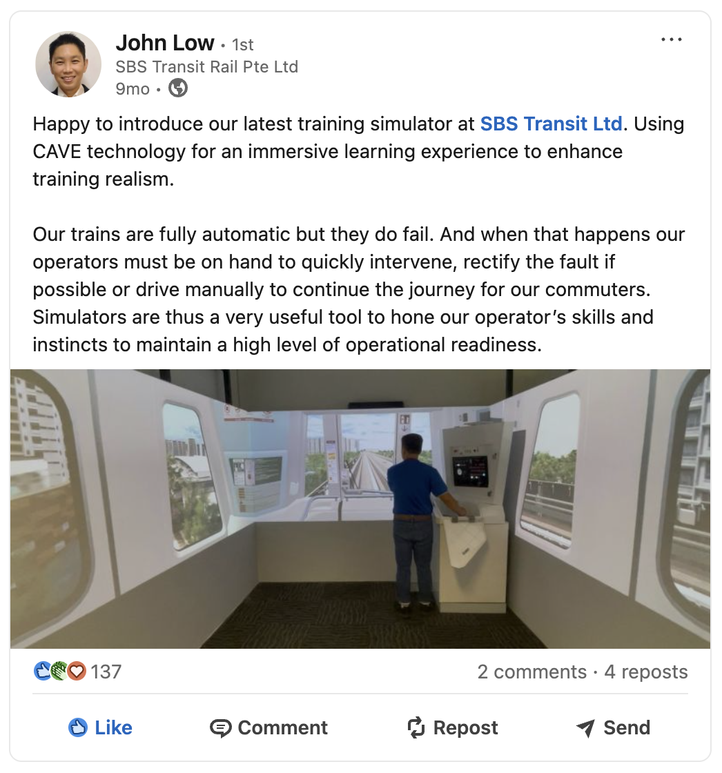 In my 2 years here, I have delivered 3 major projects with satisfactory results from our clients. Our MR sims have contributed immensely to SBST's success in training and innovation.